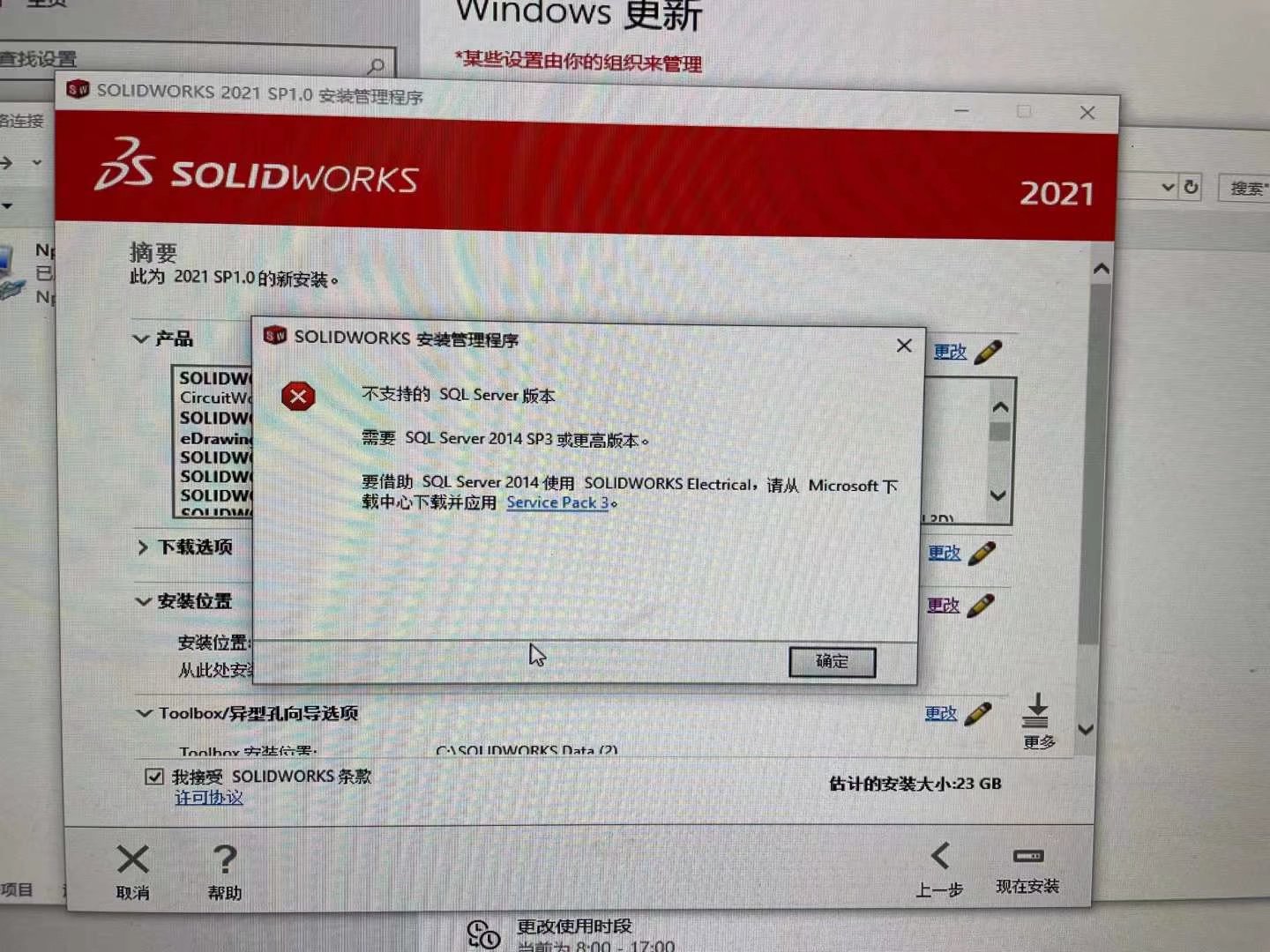 公司电脑 SOLIDWORKS2019升级到2021版本,先卸载重启电脑再安装,竟然提示说不支持的SQL server 版本……,